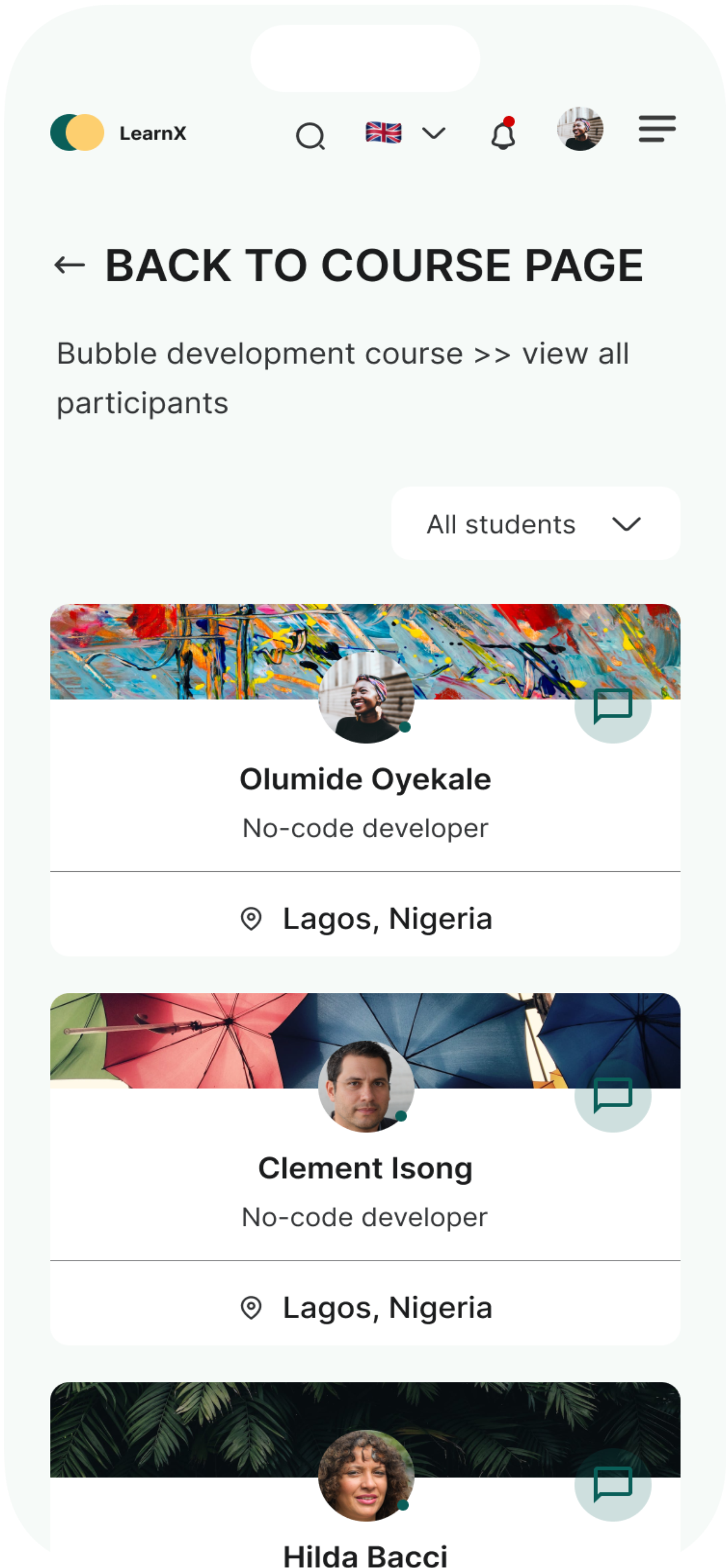 Participants page show all the students and instructors on particular course. Users can filter eiher by students or teachers and a chat icon is on each profile card to enable a user interact with their fellow student or instructor right from the participant page.