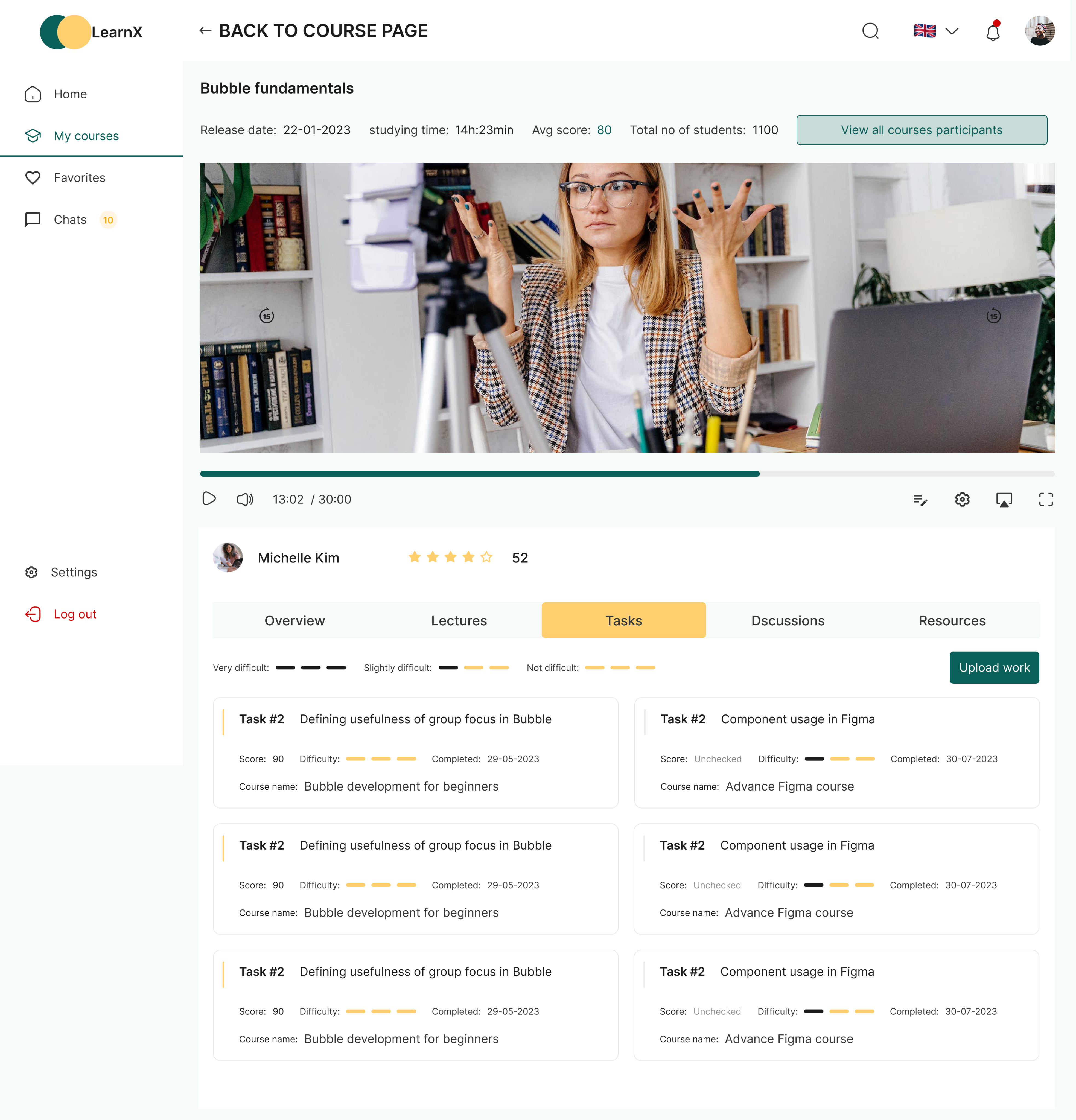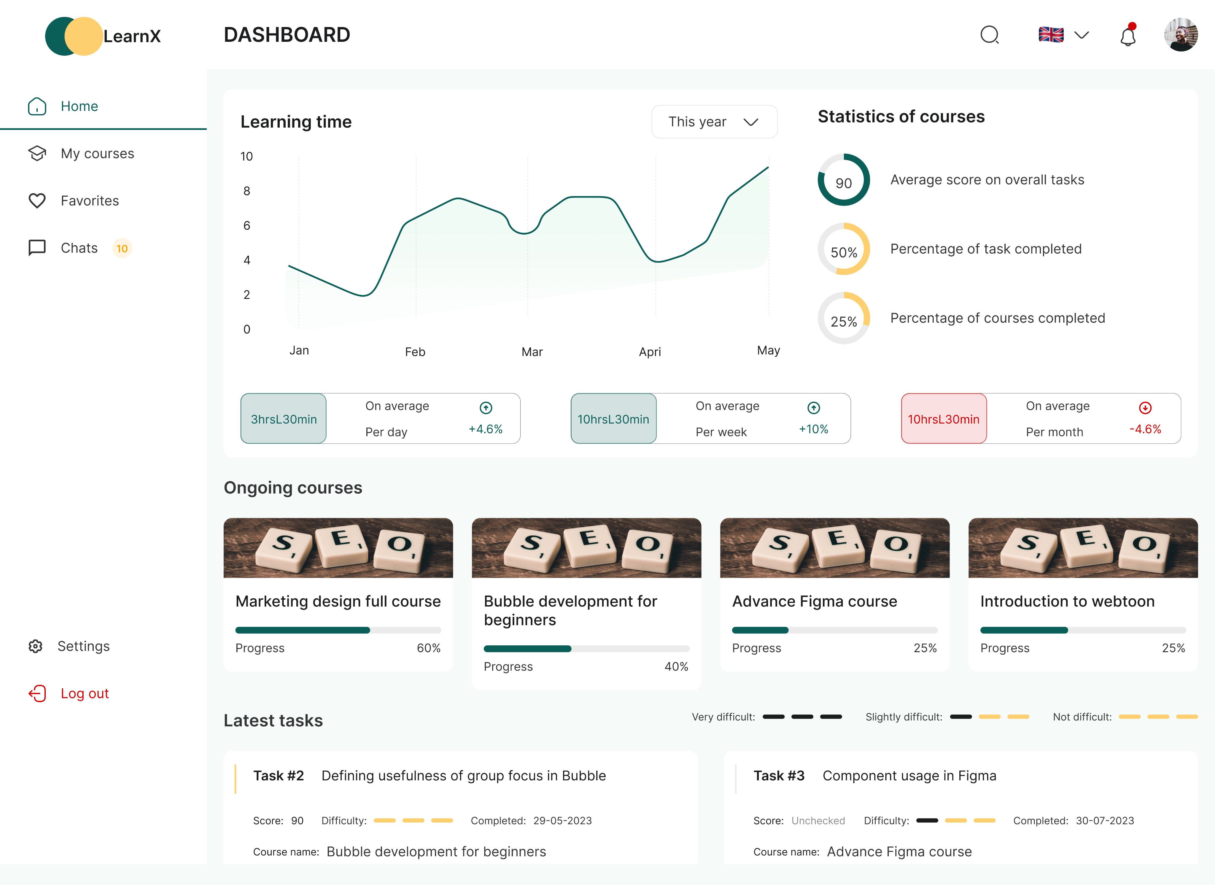 The dashboard also consist of the statistics of courses where users can see their average score, percentage of task completed, e.t.c. Users will be able to also see their ongoing courses and latest tasks right on their dashboard/home page