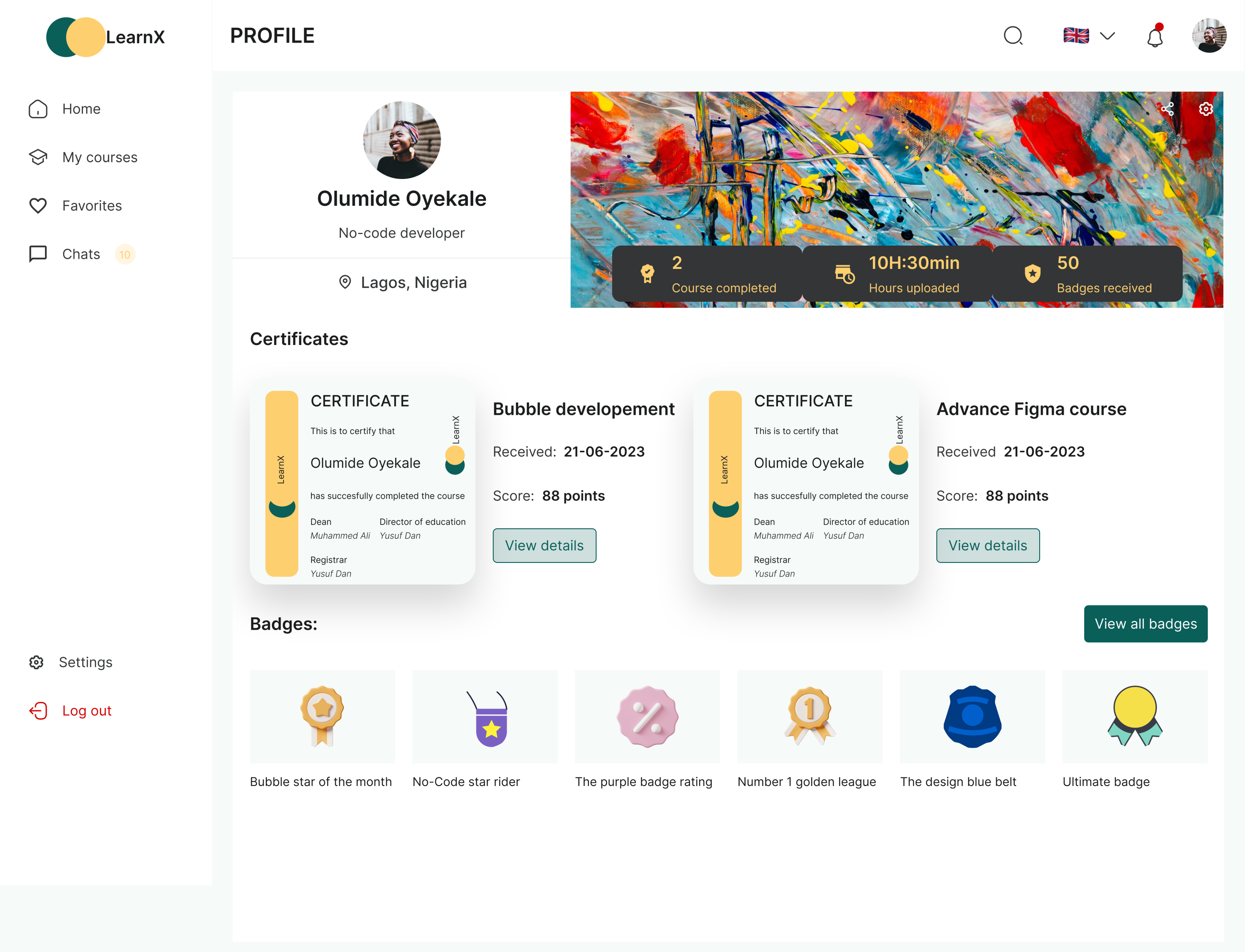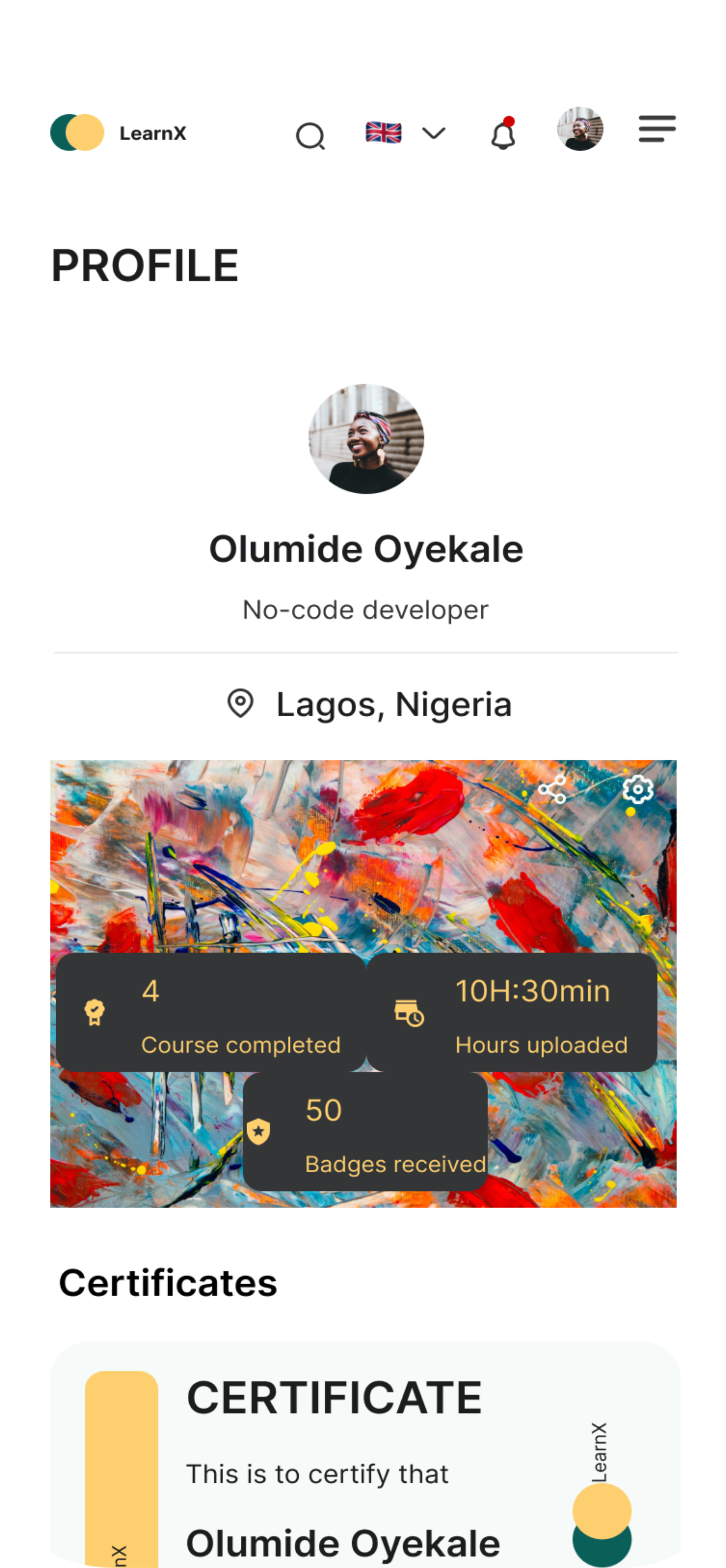 Users will be able to see their profile picture, name, location and also add a cover photo on their profile page. Their certificates and badges earned will also be display on this page.