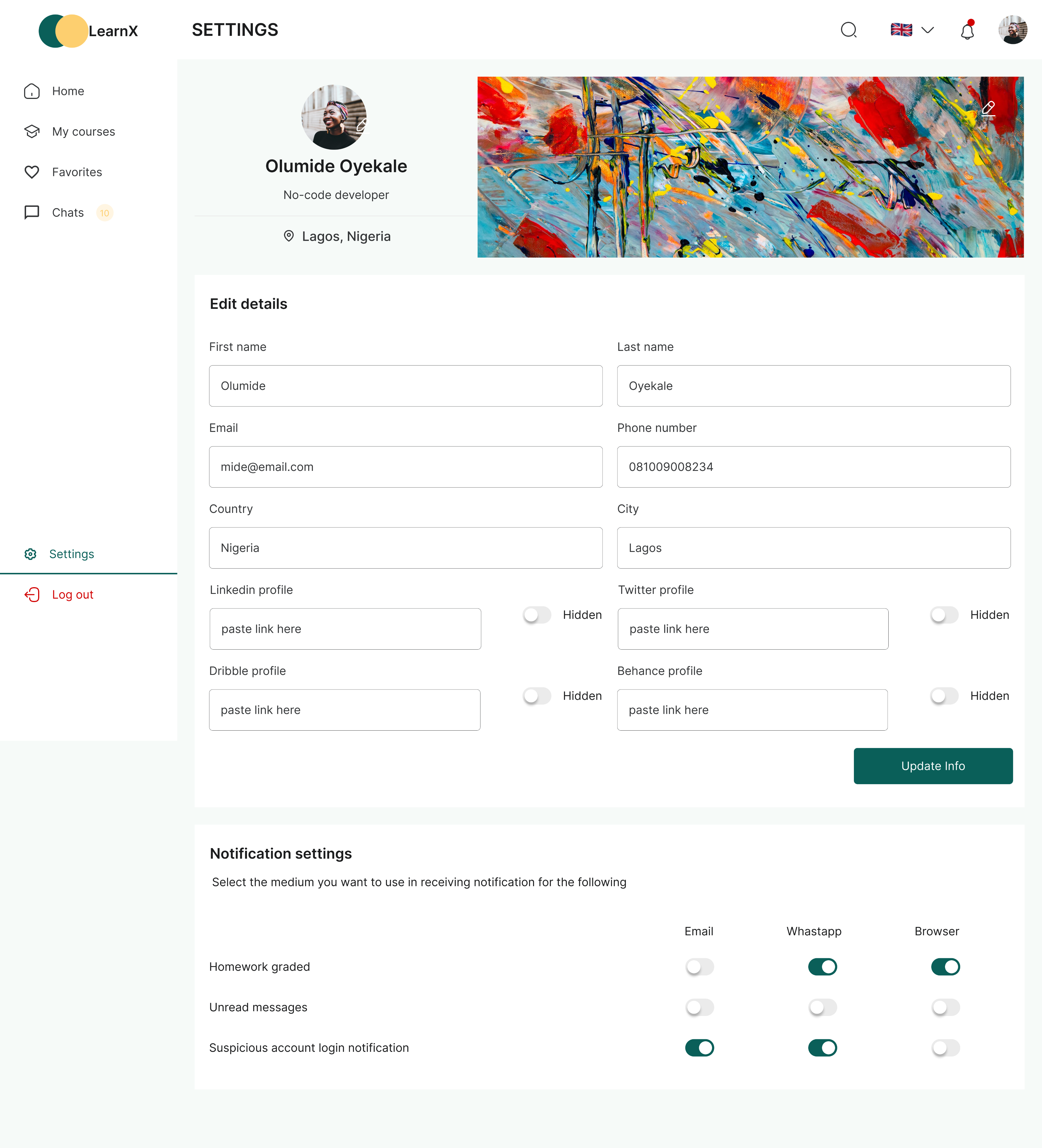 There is also notification settings on this page which will enable users to be able to manage how they want to be receiving notification about LearnX and their activities on LearnX.