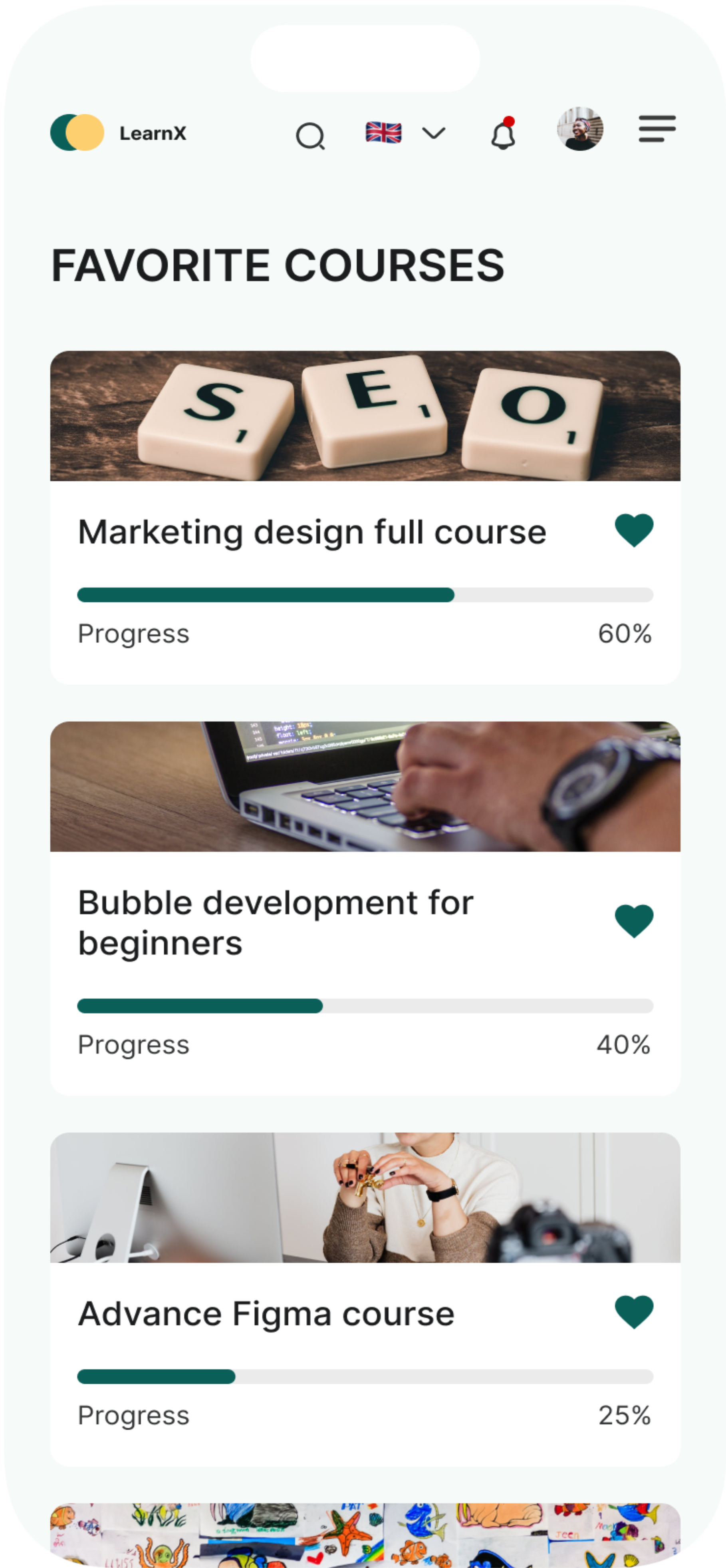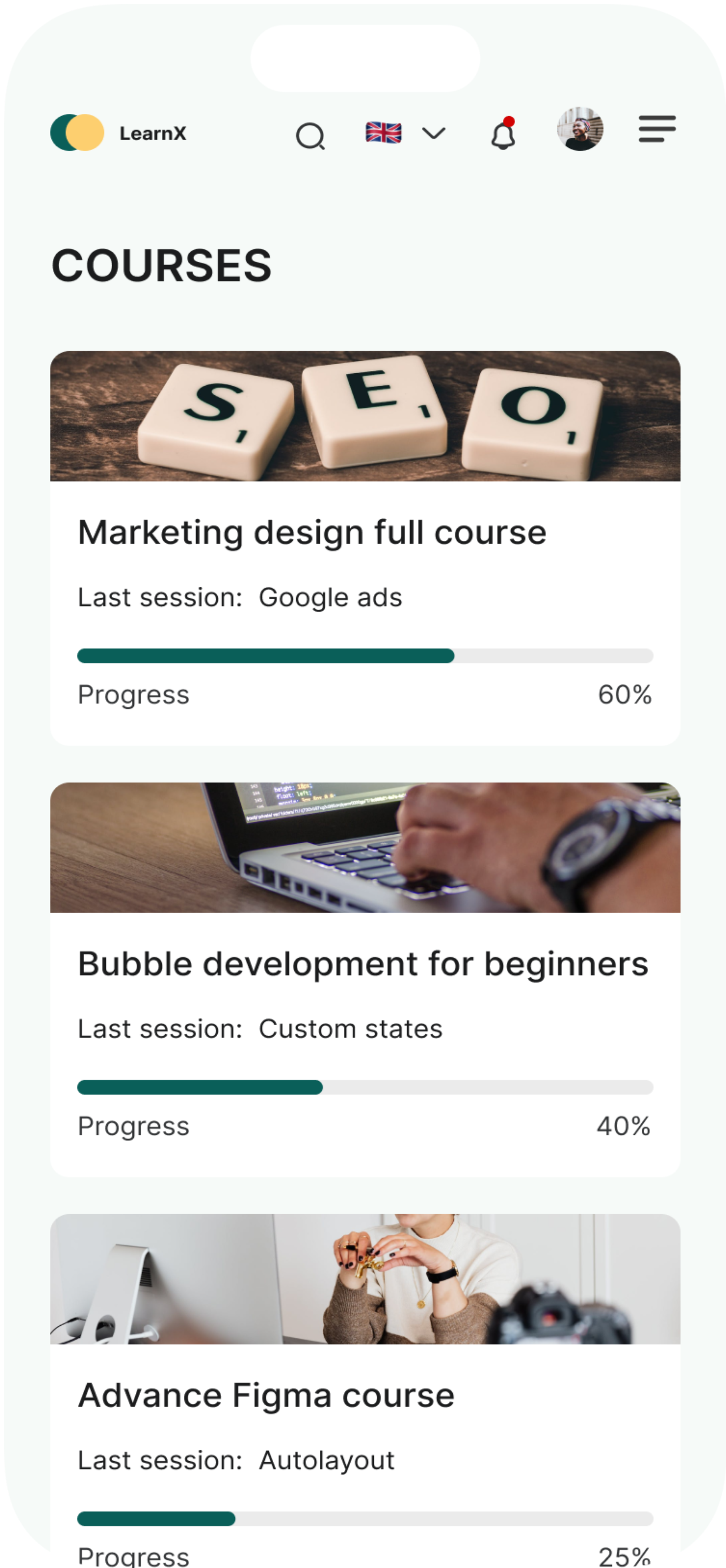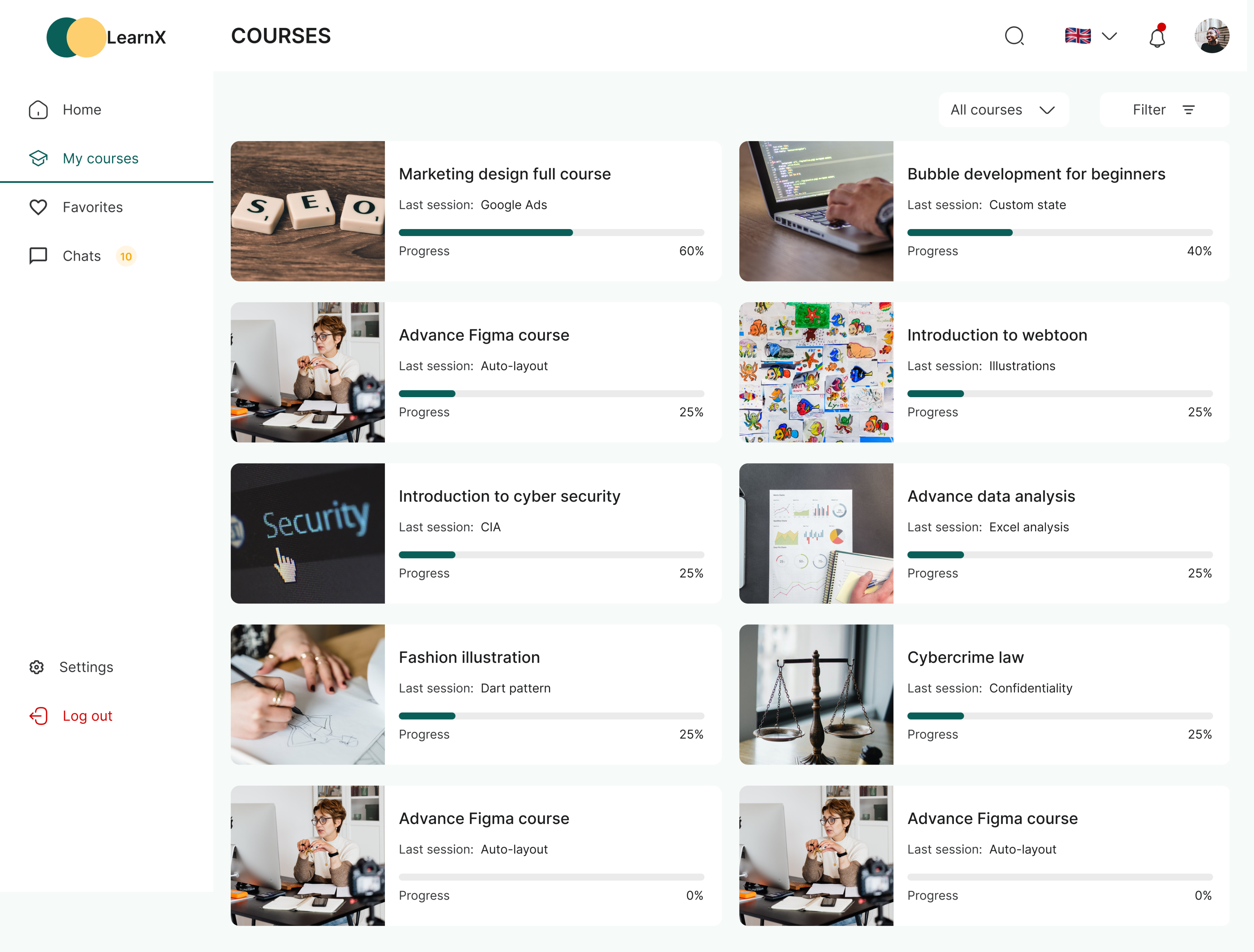 The course page is designed to show users all the courses they registered for. Users will be able to filter by either all courses, completed courses, ongoing courses. They will be also be able to filter according to the kind of profession/field courses fall under. This is to make their experience fast and delightful.