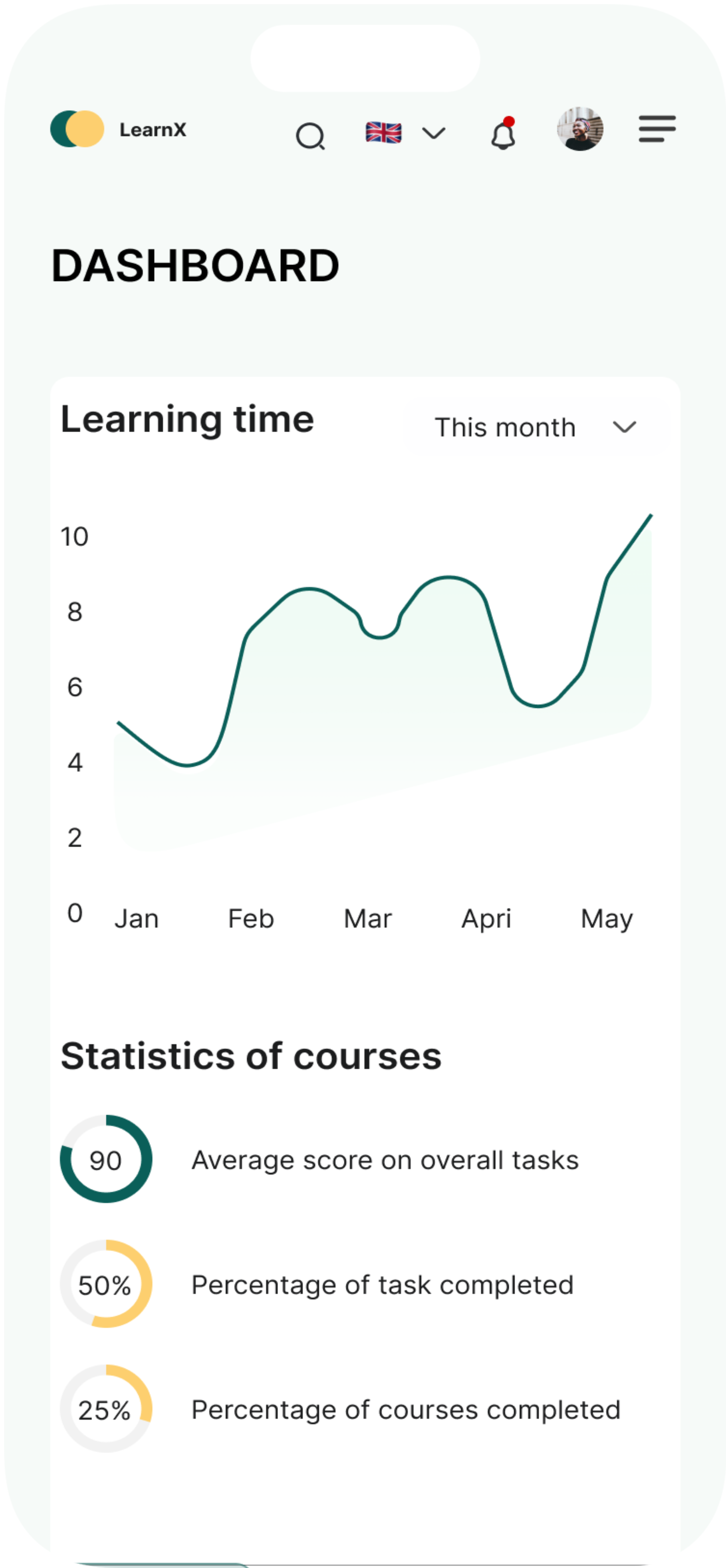 On the home screen, users can view their learning time chat to see the approximate time that are spending on their courses either per year/month/day.