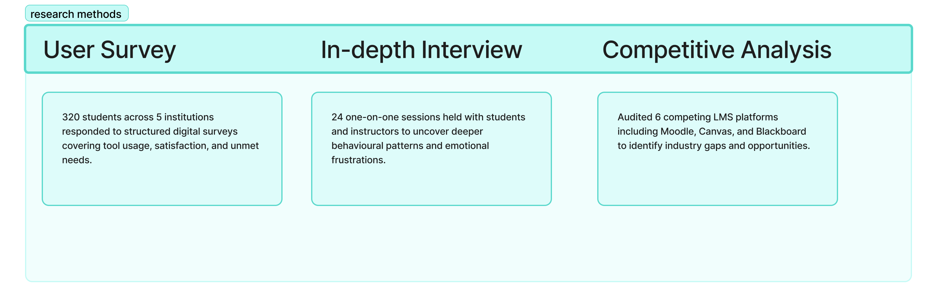 Conducted Surveys, interviews, and competitive audit to understand the full learning landscape.