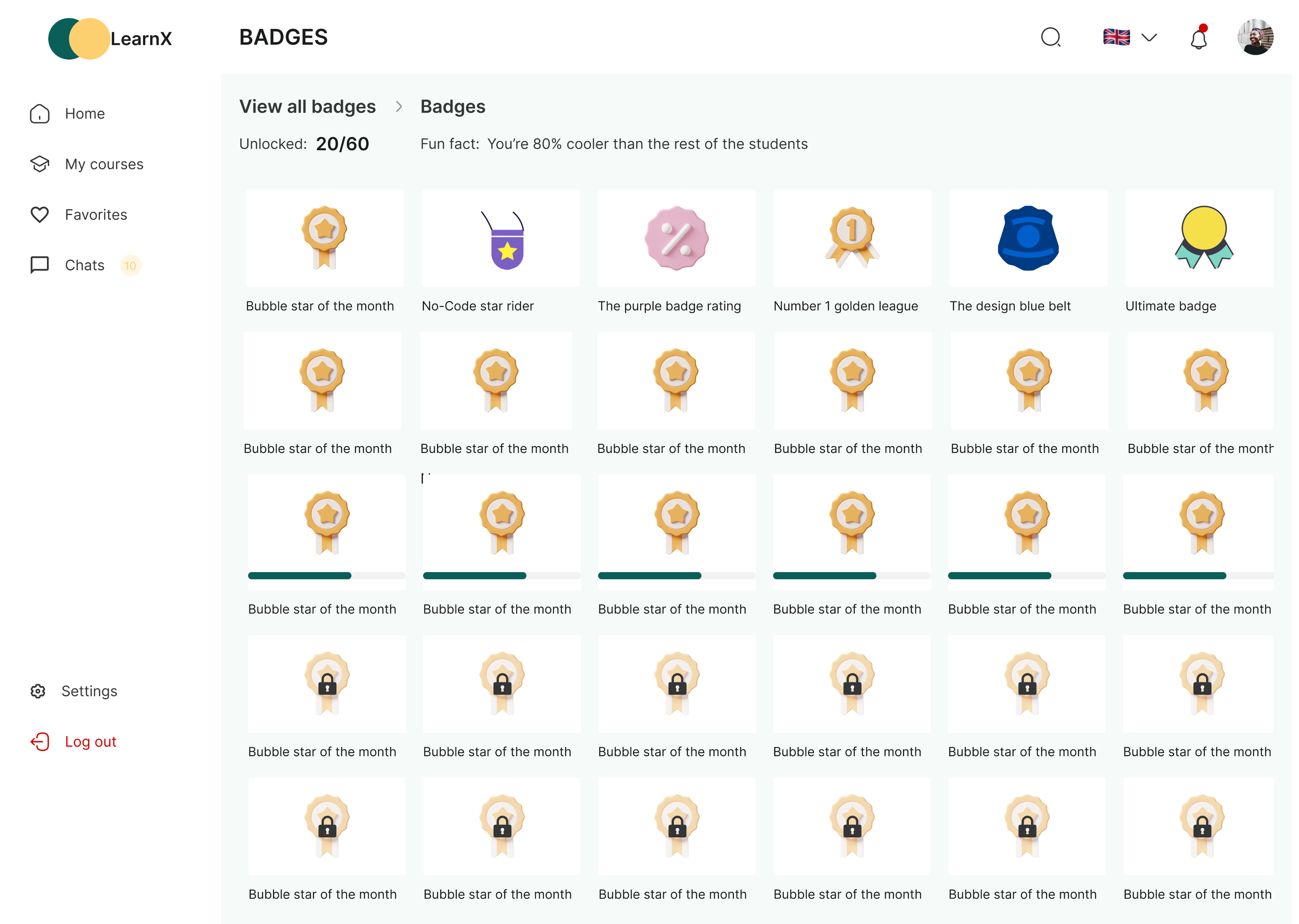 Users are to earn badges upon completing tasks on this platform. The badges page will display all the badges earned so far by the users and other badges they are about to unlock.